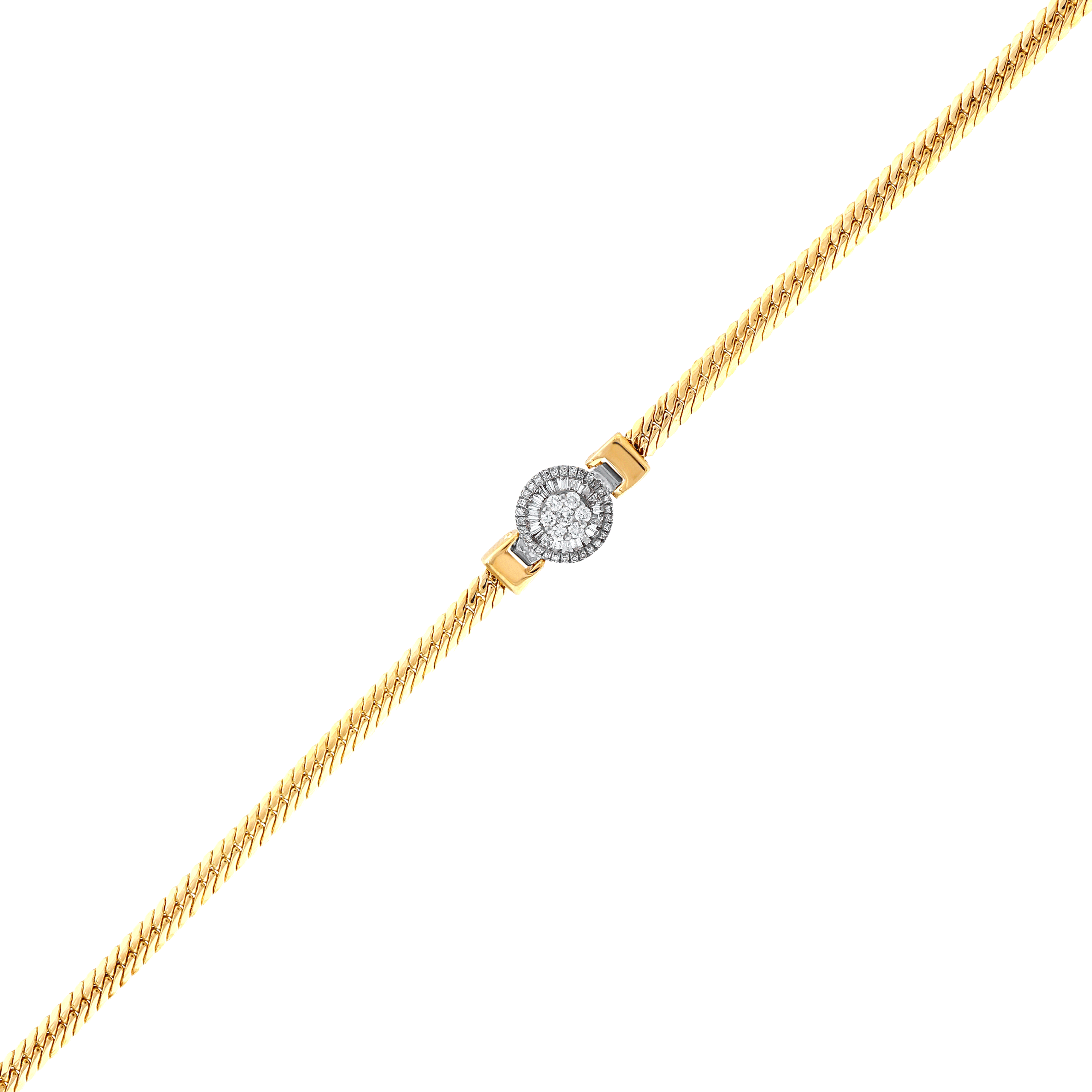 Şıklığı ve zarafeti bir araya getiren bu özel tasarım bileklik, baget pırlantaların keskin hatlarını yuvarlak kesim pırlantaların klasik ışıltısıyla harmanlıyor. 14 ayar sarı altın gövdenin zarif duruşuyla tamamlanan tasarım, toplamda 0.42 karatlık F renk ve VS berraklığında pırlantalar içeriyor. 4.06 gram ağırlığıyla bileğinizde konforlu ve şık bir duruş sergileyen bu parça, Barok Diamond kalitesini her an hissettirecek.