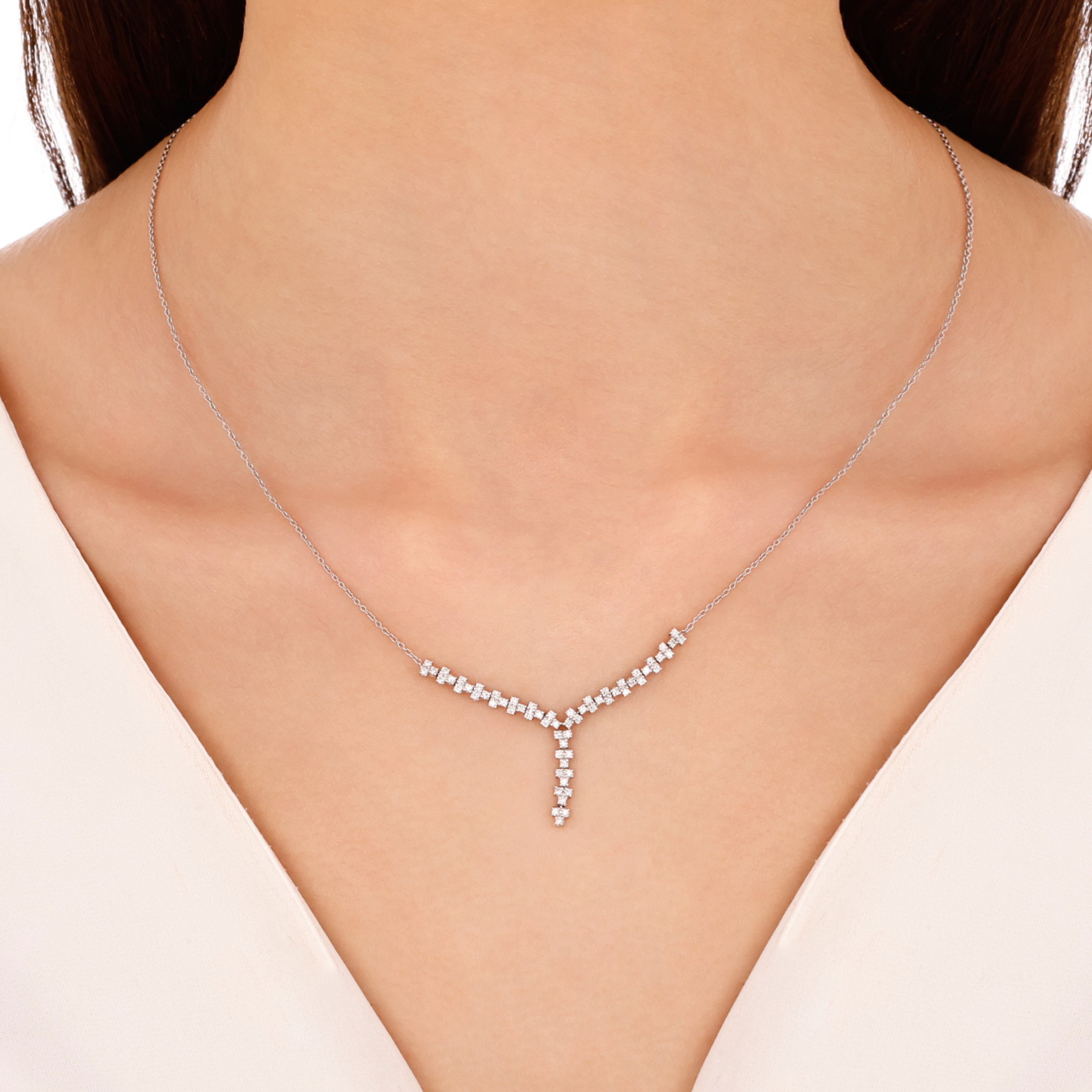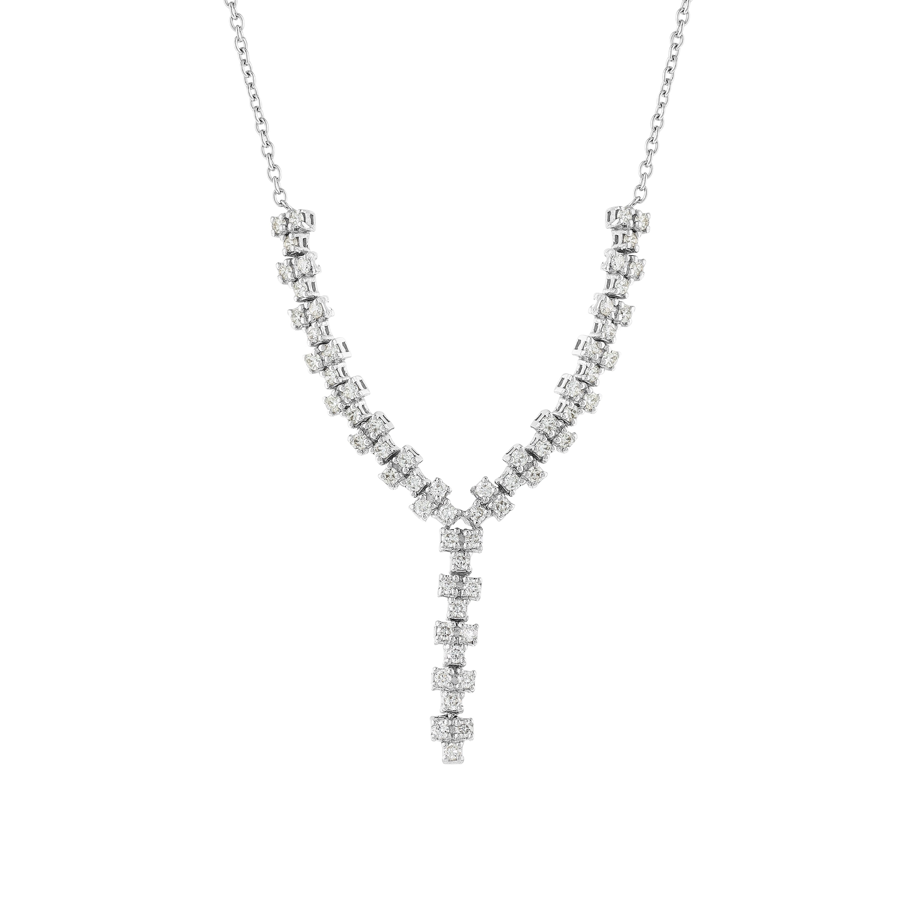 Yenilmez bir zarafet sunan Invicta fantezi kolye, pırlantanın saf ışıltısını öne çıkarıyor. 65 adet yuvarlak kesim pırlantanın bir araya gelerek oluşturduğu toplam 0.48 karatlık parlaklık, bu güçlü tasarıma hayat veriyor. 14 ayar beyaz altın gövdesi ve 3.27 gram ağırlığıyla bu kolye, her anınıza değer katacak.