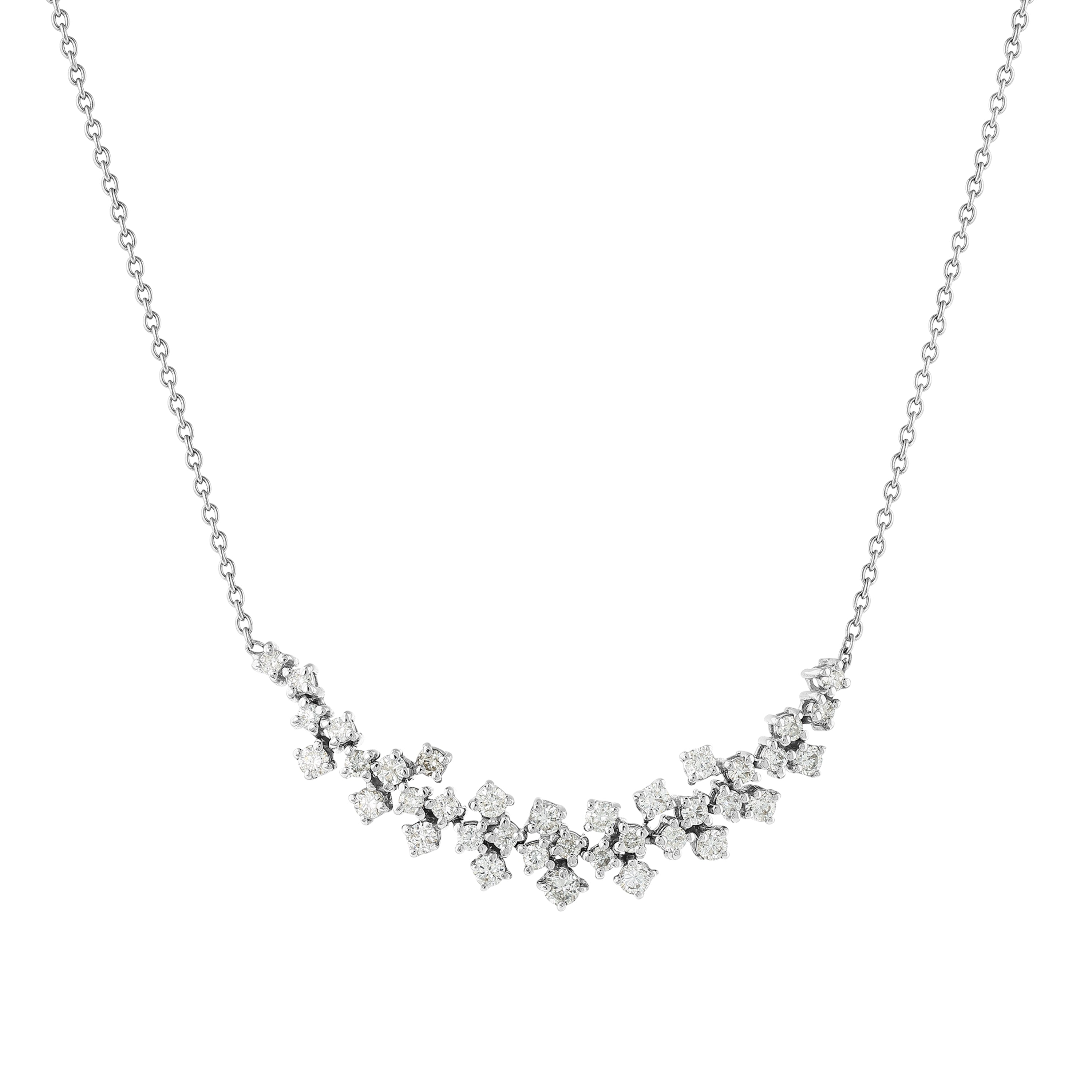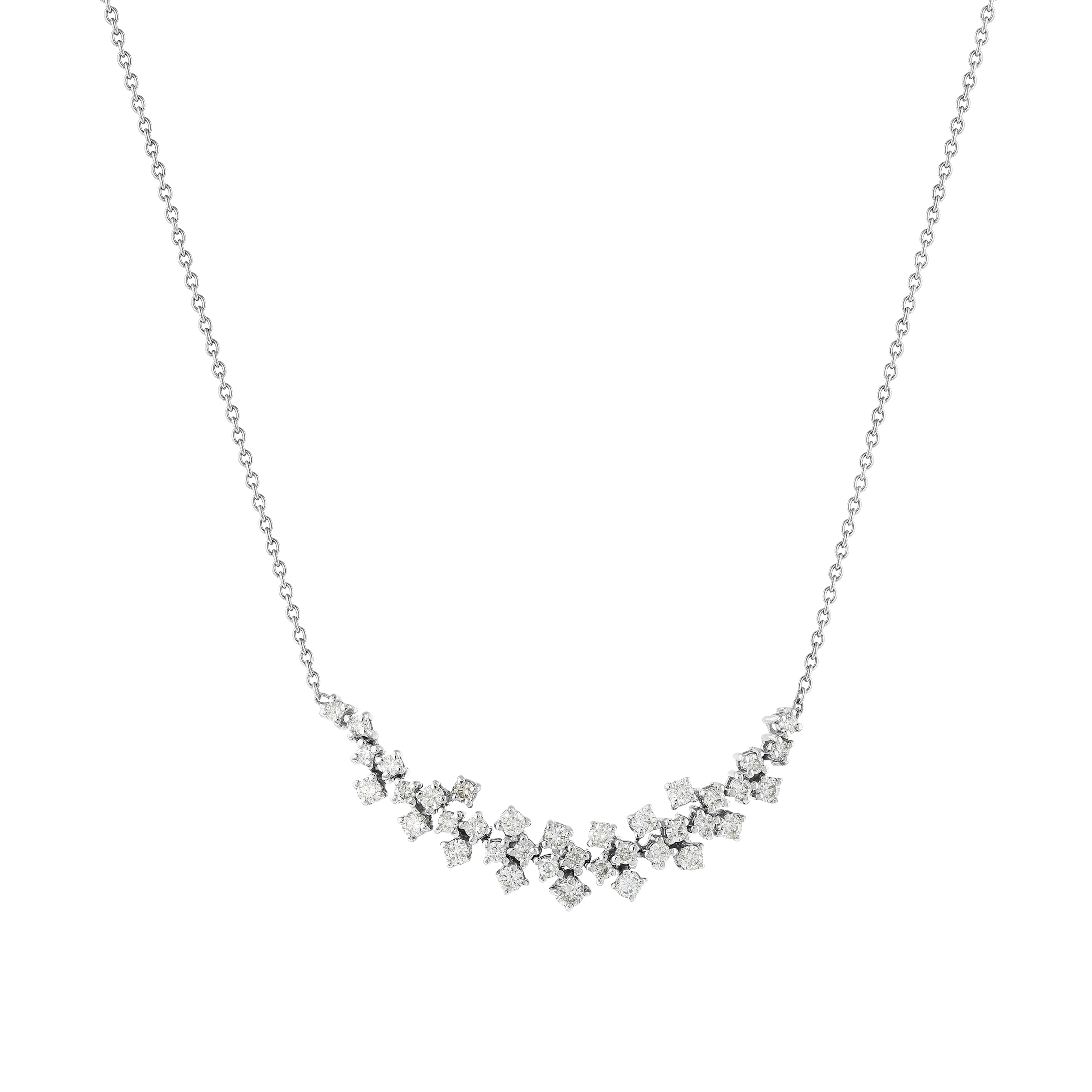 Zarif Esselia fantezi kolye, farklı pırlanta gruplarının ışıltısını beyaz altının modern duruşuyla birleştiriyor. Bu özel tasarımda, toplam 0.71 karatlık üç grup yuvarlak pırlanta bir araya gelerek göz alıcı bir parlaklık yaratıyor. 14 ayar beyaz altın gövdesi ve 4.17 gram ağırlığıyla bu kolye, her anınıza değer katacak.